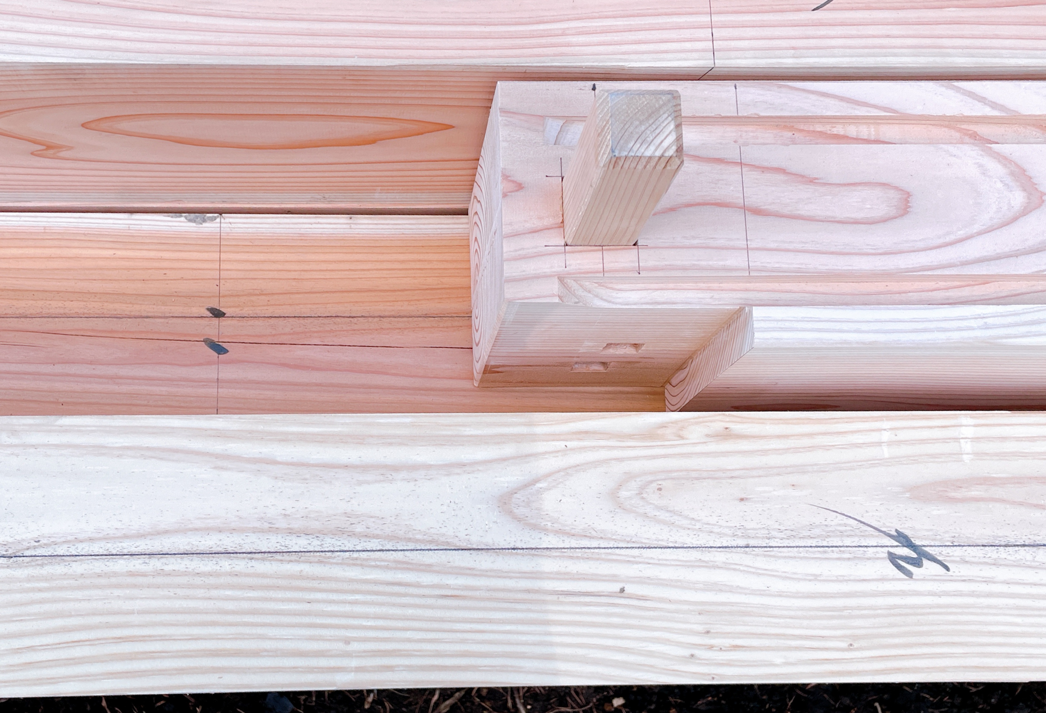 木と木を組み合わせるためにかけや(木槌)で木材を叩いて木を合わせています。木をかけや(木槌)で叩く音は低くていい音でした。