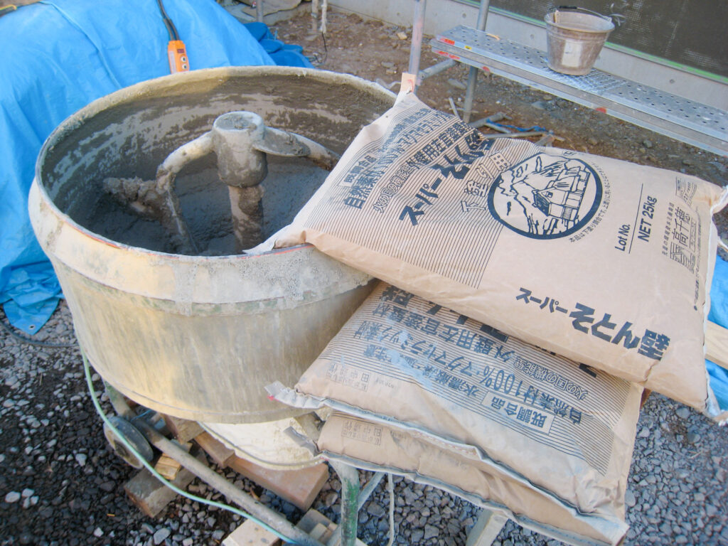 「スーパー白洲そとん壁W」は下塗り用と上塗り用があり、それぞれ10ミリ、8ミリの厚みで塗ります。下塗り用は着色されていないため、灰色でシラスそのものの色です。